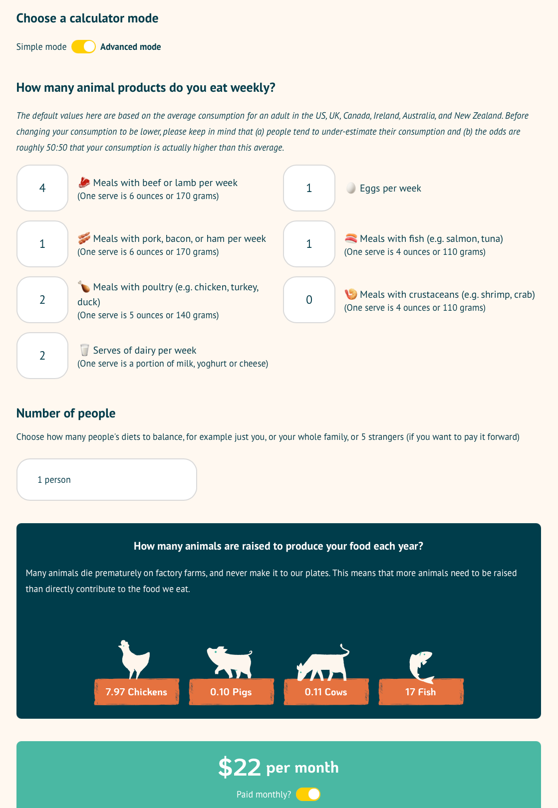 If you switch the calculator to advanced mode, you can tell it how much you eat of every particular meat / animal product each month and it will do the math with that. However, the website also warns that people tend to underestimate their consumption, which I agree with. If you want to tailor your donation amount to your particular eating habits, I recommend logging everything you eat for a month to get a good baseline, don’t just make up numbers.